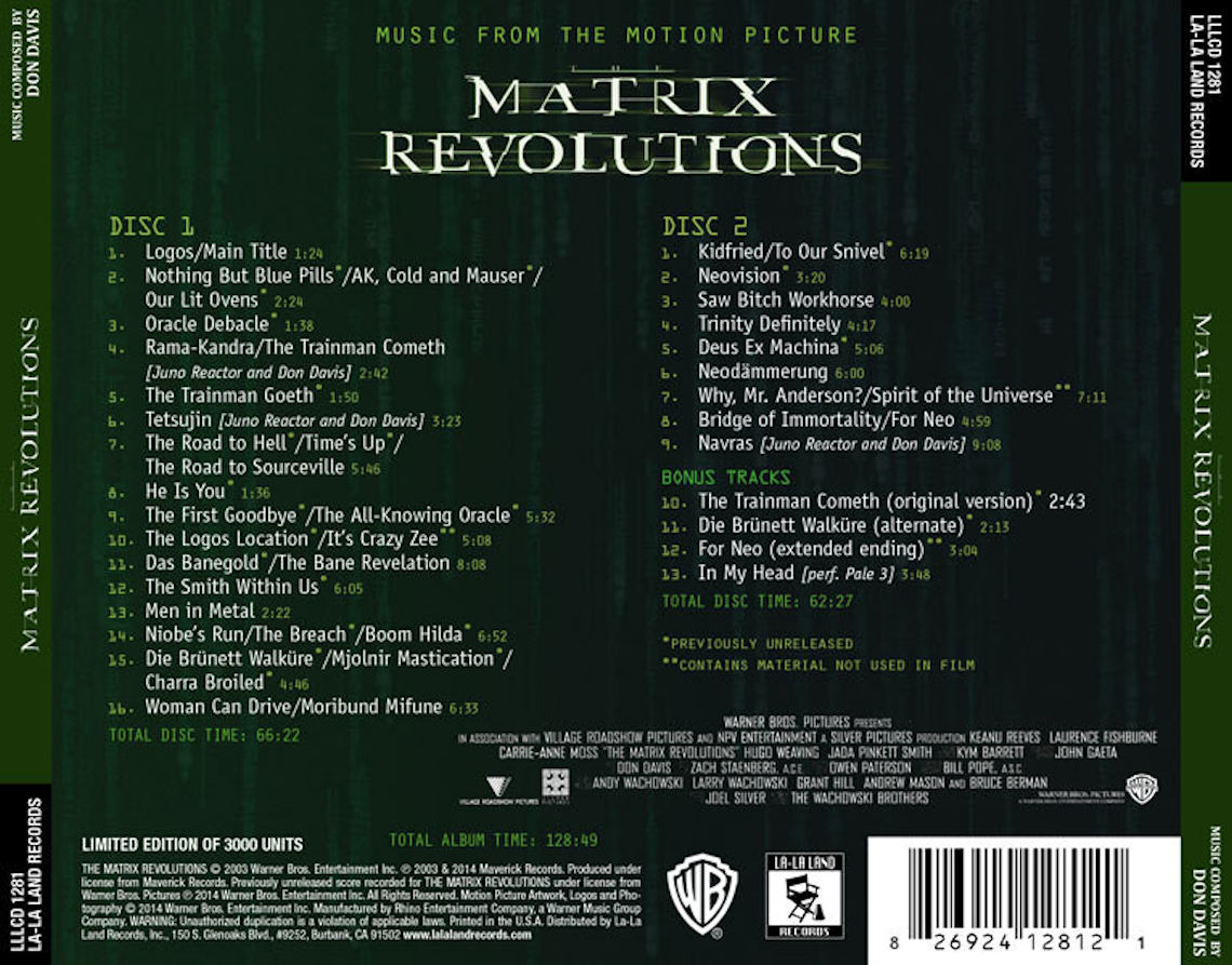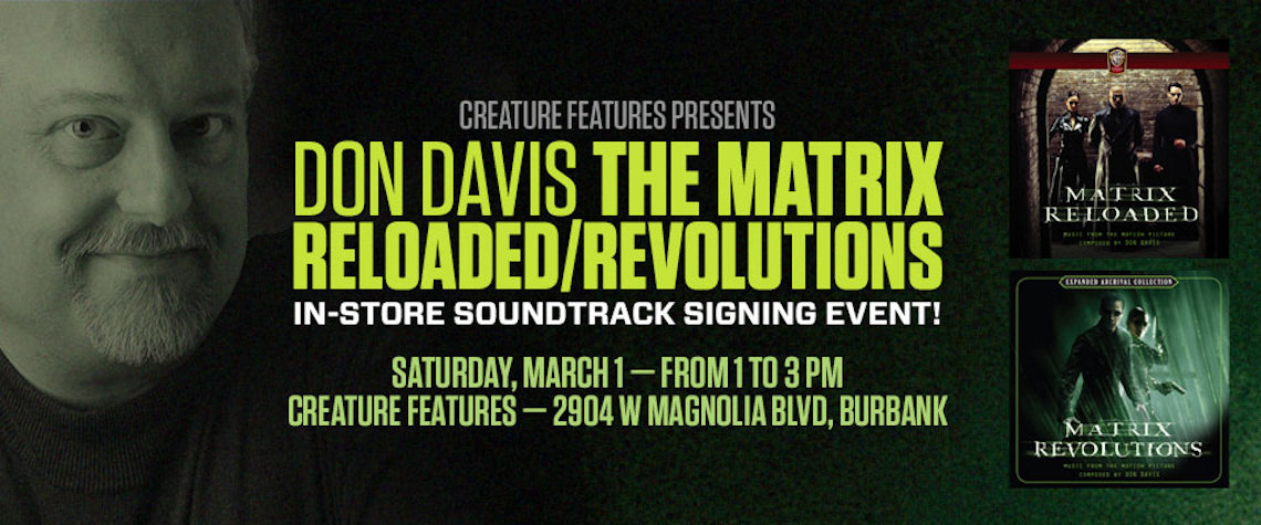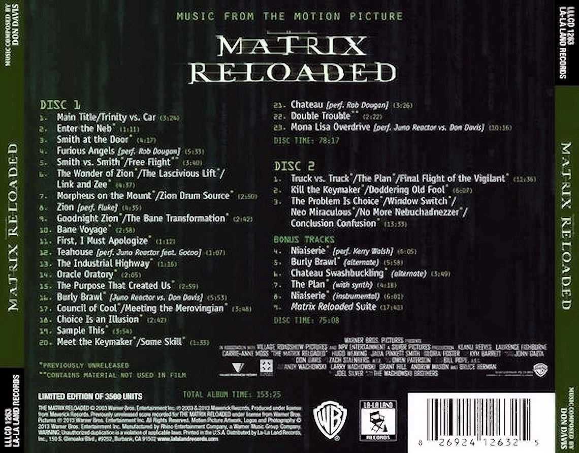 About: Don Davis' score to "The Matrix Reloaded" is available as part of the 2-disc soundtrack release from Maverick Records. "Jurassic Park III" is available on Decca Records. "The Matrix Revolutions" hit theaters in November of 2003.